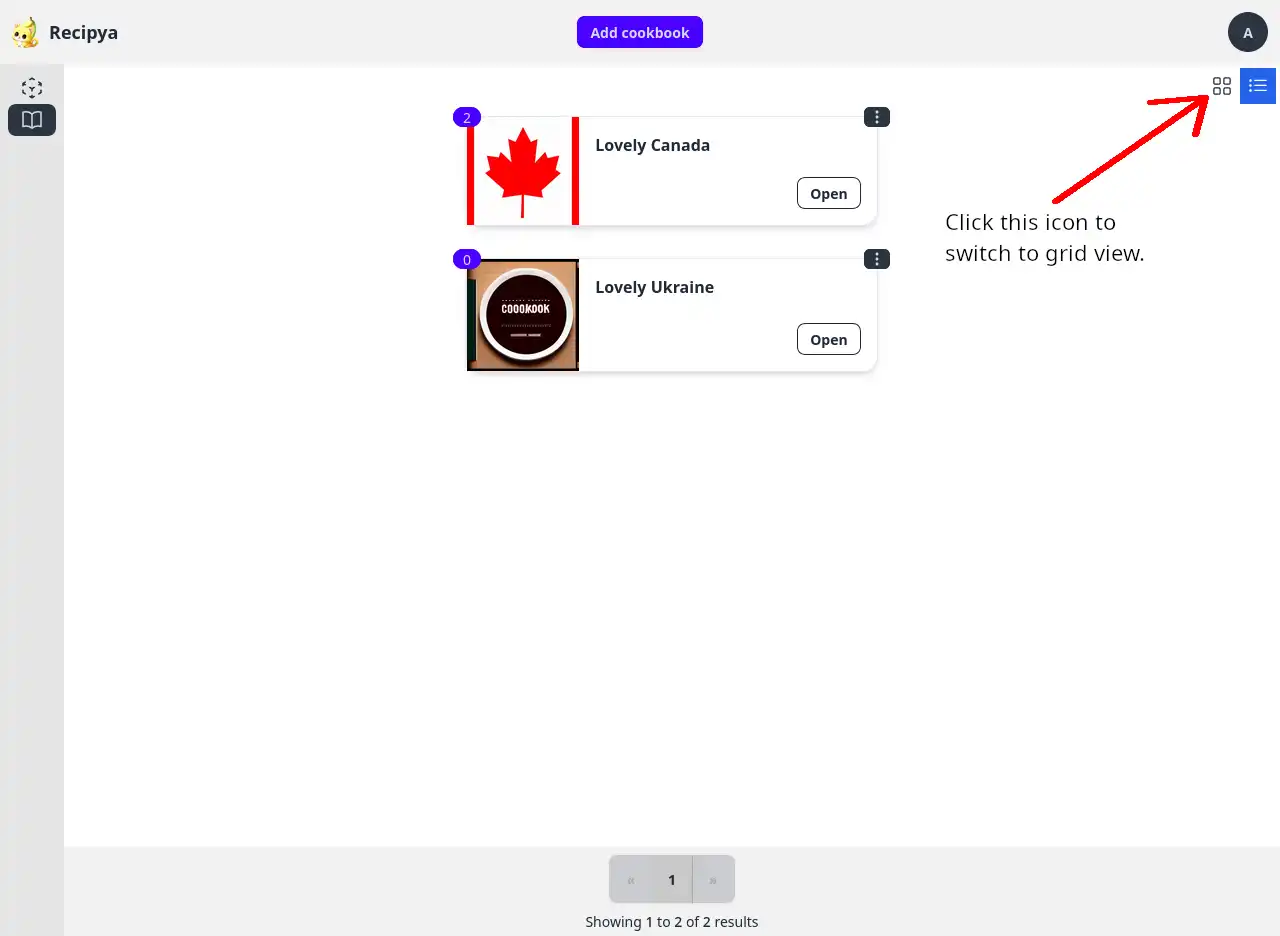 The cookbooks can be displayed in the following modes: